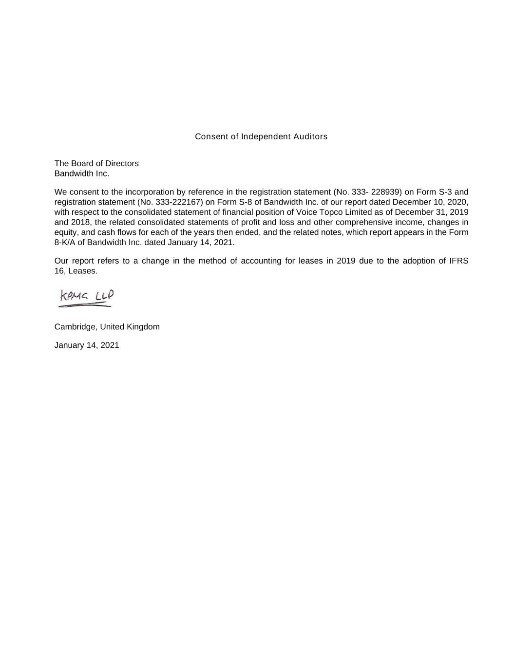 Consent of Independent Auditors The Board of Directors Bandwidth Inc. We consent to the incorporation by reference in the registration statement (No. 333- 228939) on Form S-3 and registration statement (No. 333-222167) on Form S-8 of Bandwidth Inc. of our report dated December 10, 2020, with respect to the consolidated statement of financial position of Voice Topco Limited as of December 31, 2019 and 2018, the related consolidated statements of profit and loss and other comprehensive income, changes in equity, and cash flows for each of the years then ended, and the related notes, which report appears in the Form 8-K/A of Bandwidth Inc. dated January 14, 2021. Our report refers to a change in the method of accounting for leases in 2019 due to the adoption of IFRS 16, Leases. Cambridge, United Kingdom January 14, 2021